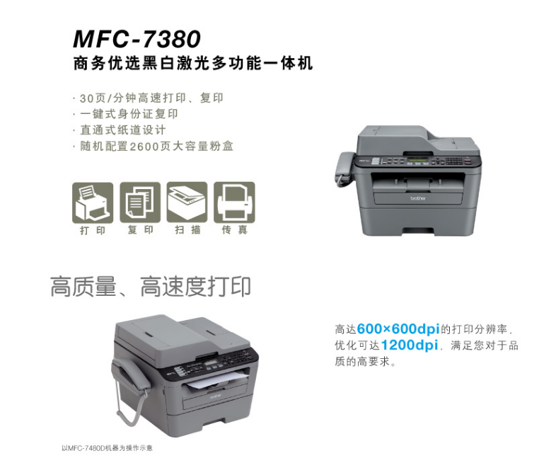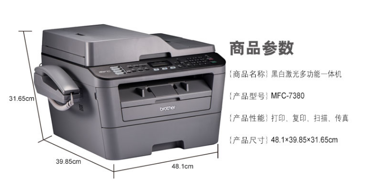 包裝清單  :   MFC-7380主機*1、隨機墨粉盒*1、使用說明*1、保修證*1、產(chǎn)品安全手冊*1、快速安裝指南*1、手柄*1、USB線*1